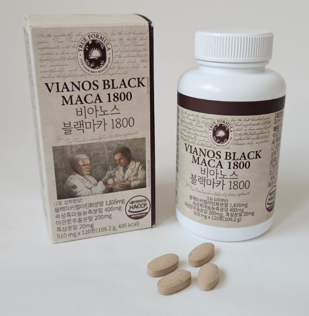 비아노스 블랙마카 1800은 주식회사 엘케이(트루포뮬러)에서 제조·유통하는 건강기능식품으로, 주원료인 블랙마카(페루 안데스 산맥 고산지대 생산/1,816mg 고함량)와 흑마늘, 야관문, 흑삼 등 신뢰받는 천연 부원료를 조합해 활력 증진 및 스태미나 향상을 목적으로 만든 제품입니다.