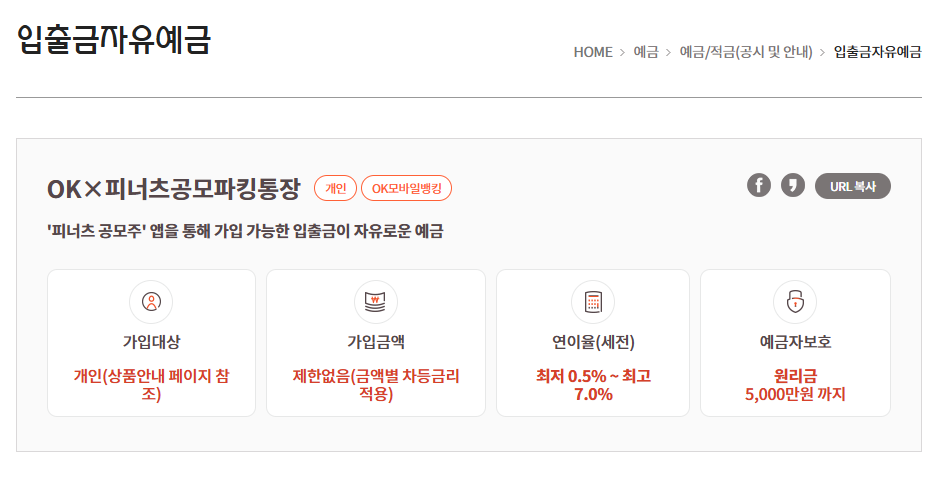 | 1 | OK×피너츠공모파킹통장 | OK저축은행 | 연 7.00% | 50만 원 | 초고금리, 조건 거의 없음, 소액 특판 |